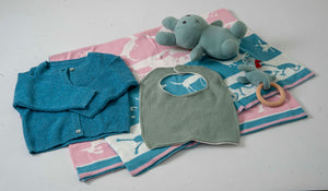 Gift Set of 5 (Blanket, Cardigan, Muslin Bib, Rabbit, Dino Rattle) | 100% Organic Cotton